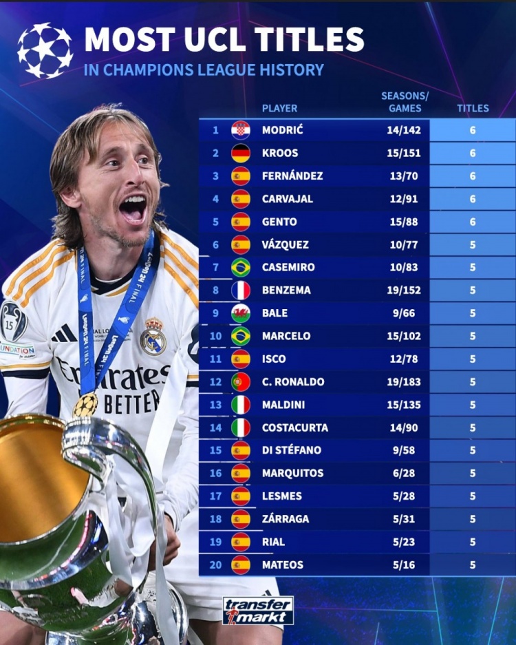 Thị trường chuyển nhượng Đức tính số lượng huấn luyện viên và người chơi giành chiến thắng trong Champions League và liệt kê các danh sách tương ứng. Trong số các huấn luyện viên, Ancelotti được xếp hạng đầu tiên với 5 chức vô địch và trong số các cầu thủ, Modric, Kroos, Nacho, Carvajal và Hento đã giành được 6 chức vô địch nhất.